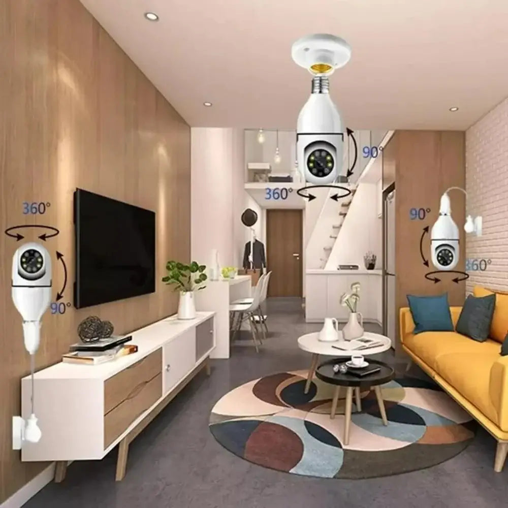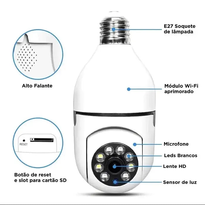 Com aparência de uma lâmpada comum, ela passa despercebida por qualquer pessoa. Seu sistema giratório (360° horizontal e 100° vertical) cobre muito mais área que câmeras comuns. Ideal para casas, comércios, escritórios, áreas externas e internas.
