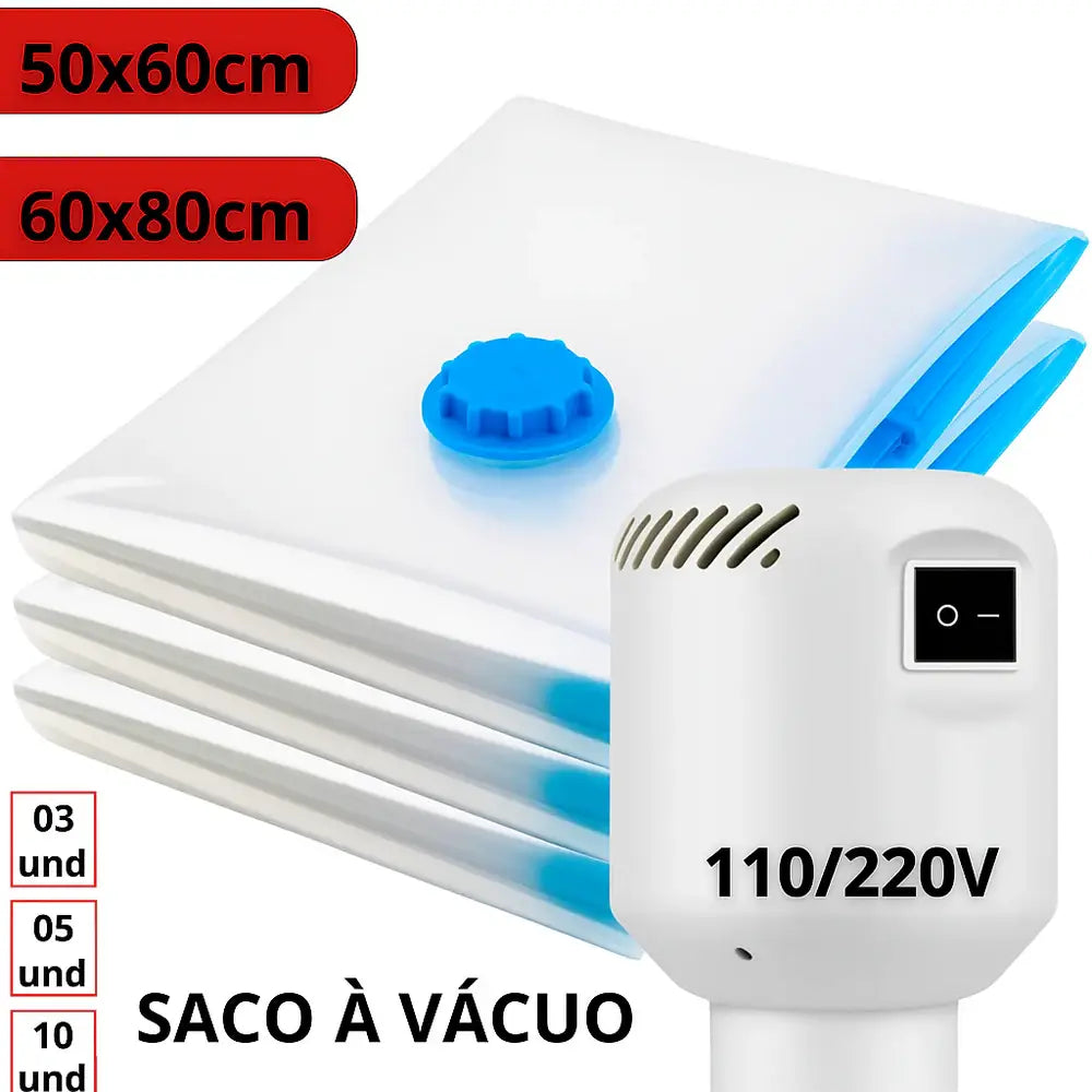 O Kit SmartVac vem com 10 sacos reutilizáveis e uma bomba elétrica potente, que retira o ar em segundos e reduz drasticamente o volume de roupas, edredons, toalhas e mais. Ideal para quem quer organização, praticidade e espaço de sobra em casa ou na mala de viagem.