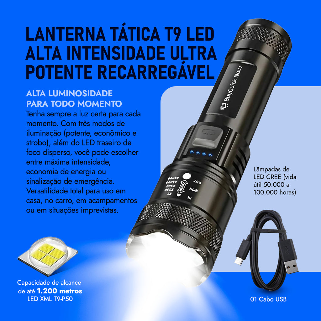 A Lanterna Tática T9 Militar foi projetada para entregar máxima performance em ambientes extremos. Com 1200 lumens de potência e zoom ajustável de longo alcance, ela ilumina até 420 metros de distância, com estabilidade e foco preciso. Ideal para quem enfrenta trilhas, apagões, trabalhos noturnos ou precisa de uma ferramenta confiável no porta-luvas.